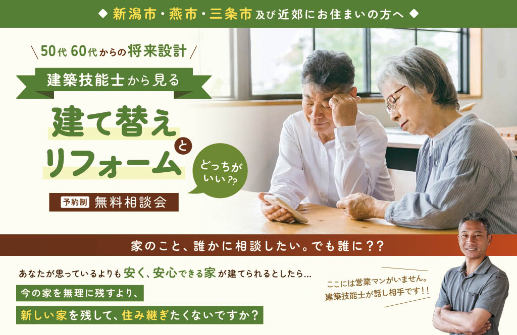 50代、60代からの将来設計 家のこと、誰かに相談したい。でも誰に? 【予約制 】建築技能士から見る『建て替えとリフォーム どっちがいい?』 無料相談会 会場:木の香住宅事務所(新潟市西蒲区)営業時間:9:0…