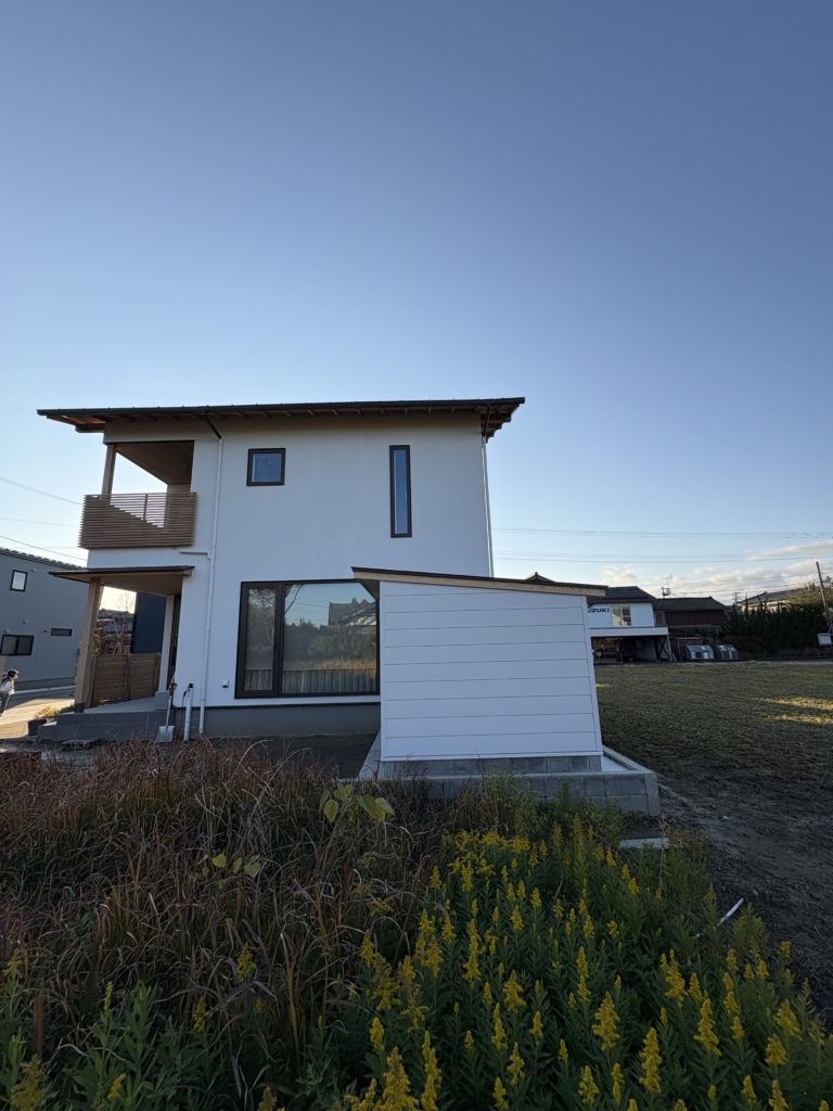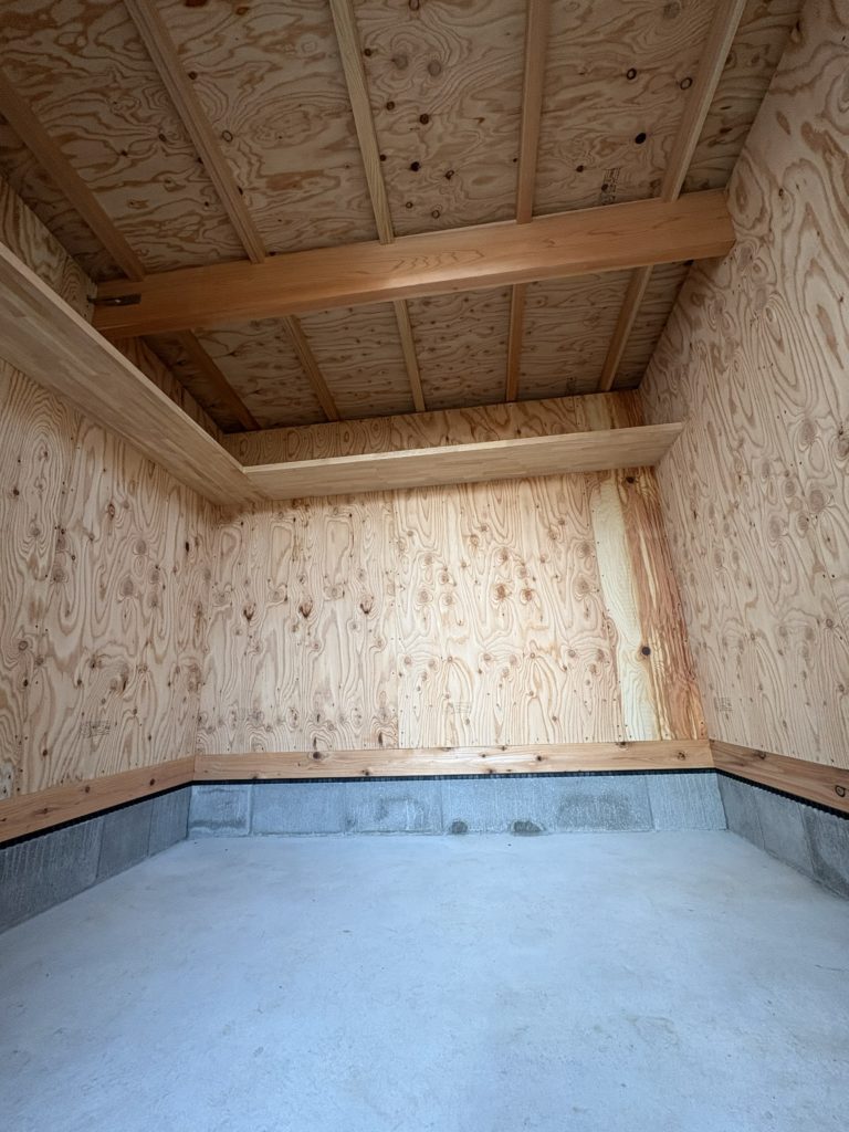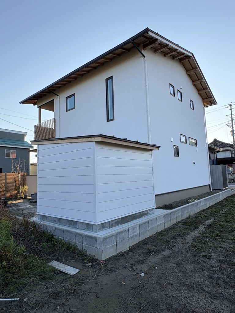 I様邸物置小屋 2025.11.26 完成!! 屋根=チャコールブラウン立平葺き 外壁=アイジー工業 SPビレクト(ネオホワイト) ドア=リクシル外部物置ドア L字に棚をつけて完成~ これでお家回りもスッキリしますね😊😊😊